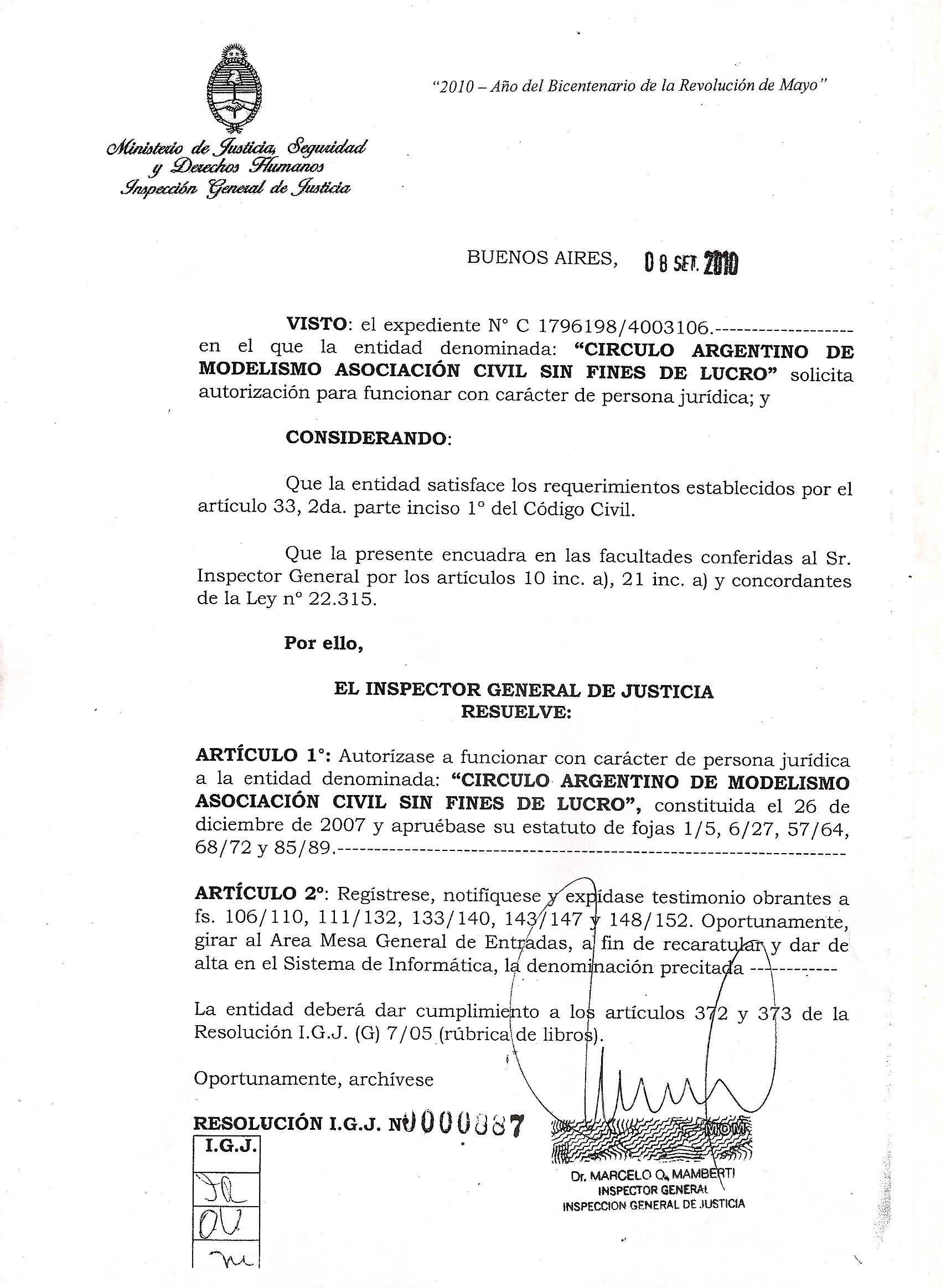 el Círculo Argentino de Modelismo (C.A.M.) fue autorizado de forma definitiva para operar con carácter de Persona Jurídica bajo la